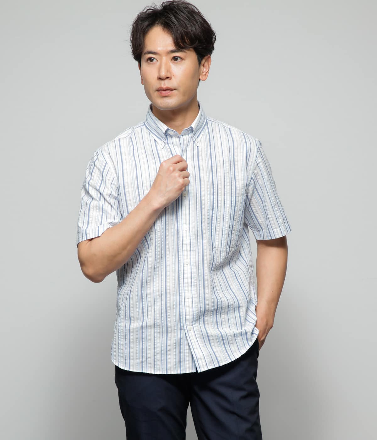 【サマーフェア開催中】 清涼感あるパナマサッカーストライプシャツ。 着心地も柔らかく、夏場に快適な装いを。 ネイビーのボトムスを合わせ タックインしてスタイリッシュに着こなせます! 少し遊び心が欲しい時はカットソーやカーディガンなどを肩掛けしてみてくださいね!